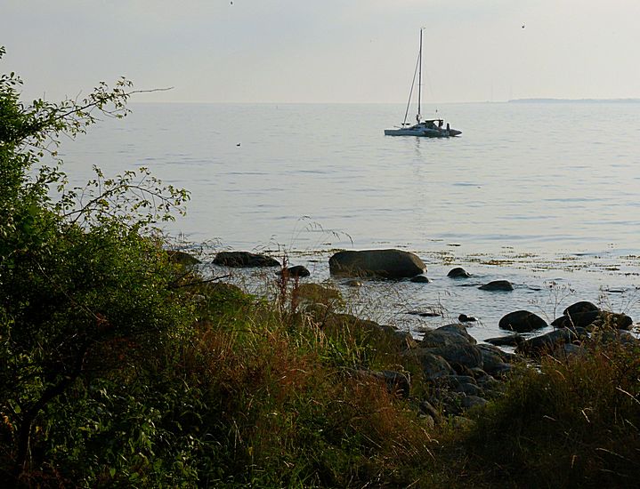 Der kleine Trimaran entzieht sich durch Ankern dem Hafentrubel