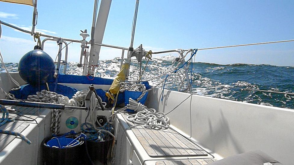 Später verdecken die Wellenkämme zeitweise den Horizont Der Autopilot steuert und ich lasse mich von der Sonne wärmen, denn der Wind ist kalt. Das Bild ist aus einem Video ·< Anfang | < Zurück | Übersicht | Weiter > | Ende >· Bild 25 von 25;